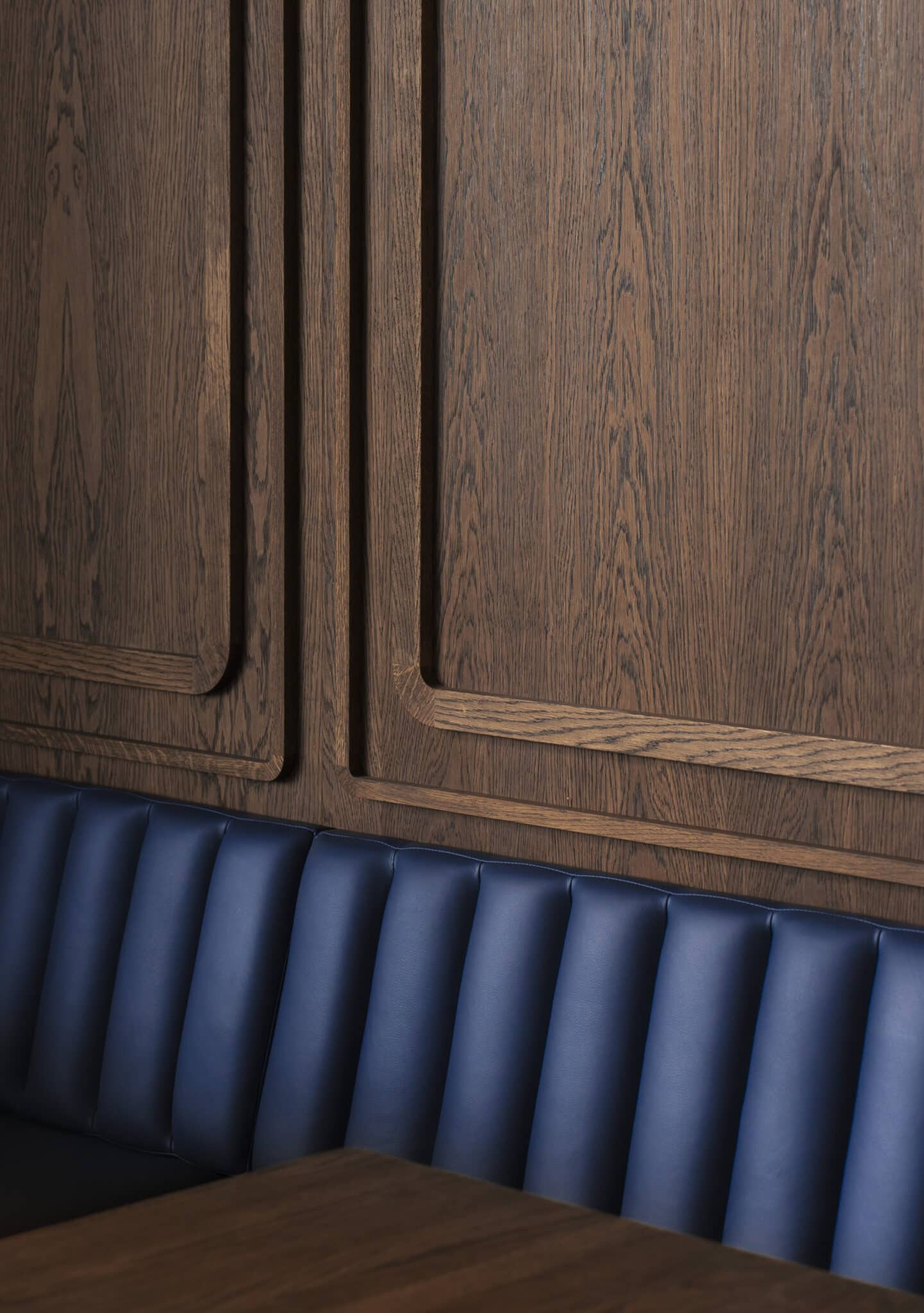 i restauranten. De blå lædersofaer er en naturlig reference til det maritime