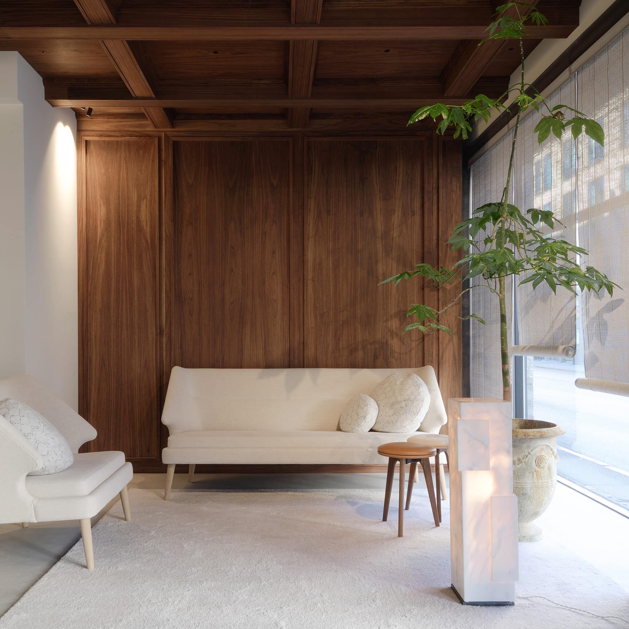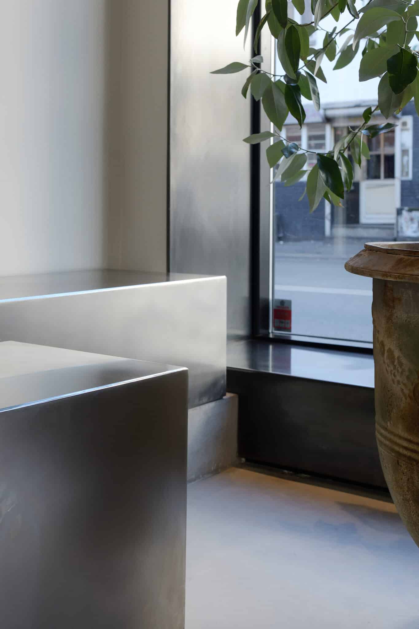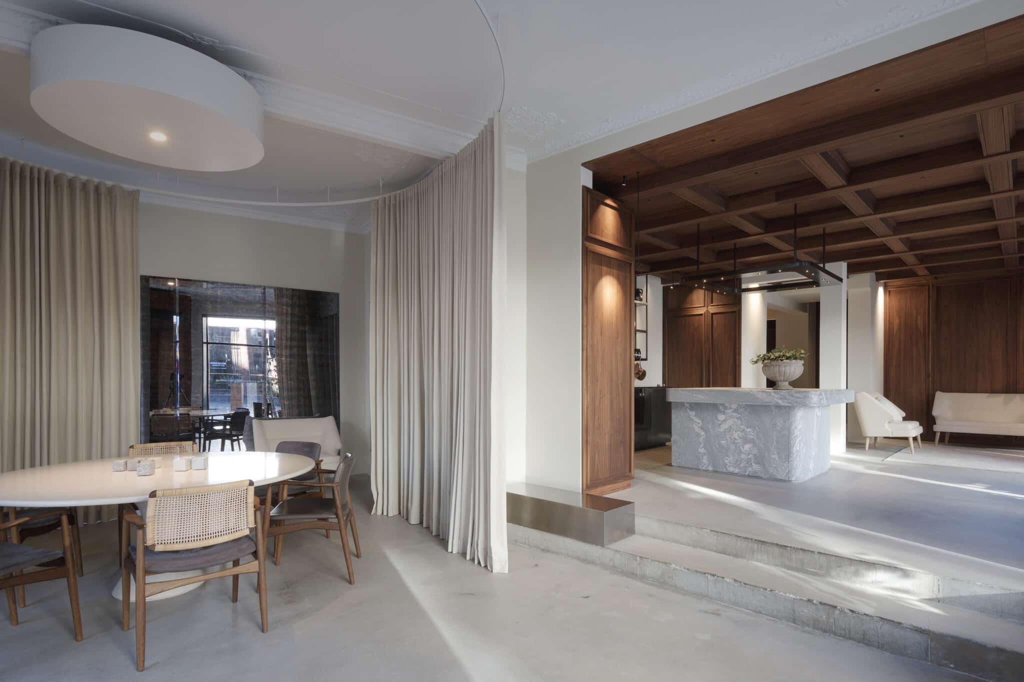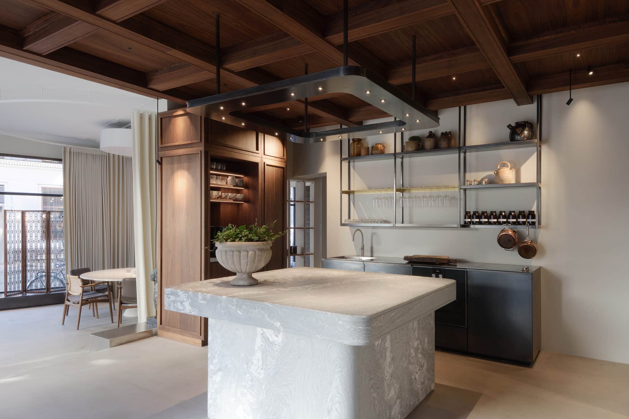 gennemgående materialepalette af træ, stål, natursten og tekstil skaber visuel